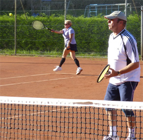 Tegelijkertijd, maar wat sneller klaar was de herendubbel op baan 2: Theo Hesse ( u weet wel, die motorbendeleider ) met de Boeddhist Fred van beRaam tegen de sterkspelende Beugelaar en Wijnberg (van o.a. Ajax en Smikky)... Het was echt een spetterende halve finale, waarin Theo&Fred achter acteerden als een goed ingespeeld dubbel en daarom wellicht ook wel verdiend wonnen: 7-5 en 6-4. Zoek troost bij elkaar Henk en Martin. Jullie hebben het fantastisch gedaan...petje af !!! Voor Martin rest nog de GD 7 finale tegen Erik en ega Sandra....zeer interessant.