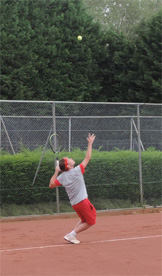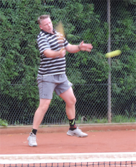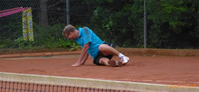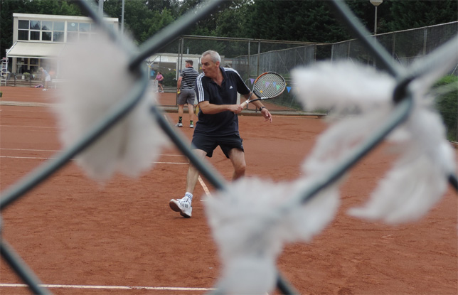 Op baan 3 werd het zoals verwacht een spannende pot met lange rally's waar heel veel gelopen moest worden, met twee mannen die ook niet teveel risico plegen te nemen ....De conditie gaat dan een steeds grotere rol spelen. Wij van de organisatie wisten dat Ronald al een paar zware dagen met weinig rust (geestelijk en lichamelijk) er op had zitten, en dat werd hem in deze match fataal, zeker als de goed spelende Ton de tegenstander is. Ronald struikelde zelfs over zijn eigen benen en kwam op het gravel te liggen....het duurde even voor hij weer opstond ....."Lekker uitrusten", bleek achteraf :-) , waar sommigen ook geschrokken waren. Wel achter de duivenveren (zie foto van Fred van Raam) werd het een 6-4 7-5 winst voor Ton....Wow, de To(o)n is gezet in deze poule (waar ik ook deel van uitmaak)......bibber de bibber...